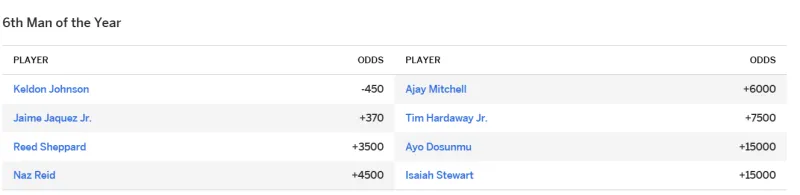 虎扑04月09日讯 今日ESPN官方更新了本赛季最佳第六人的赔率榜单,马刺球员凯尔登-约翰逊以-450位居榜首,热火球员小海梅-哈克斯以+370位居次席。